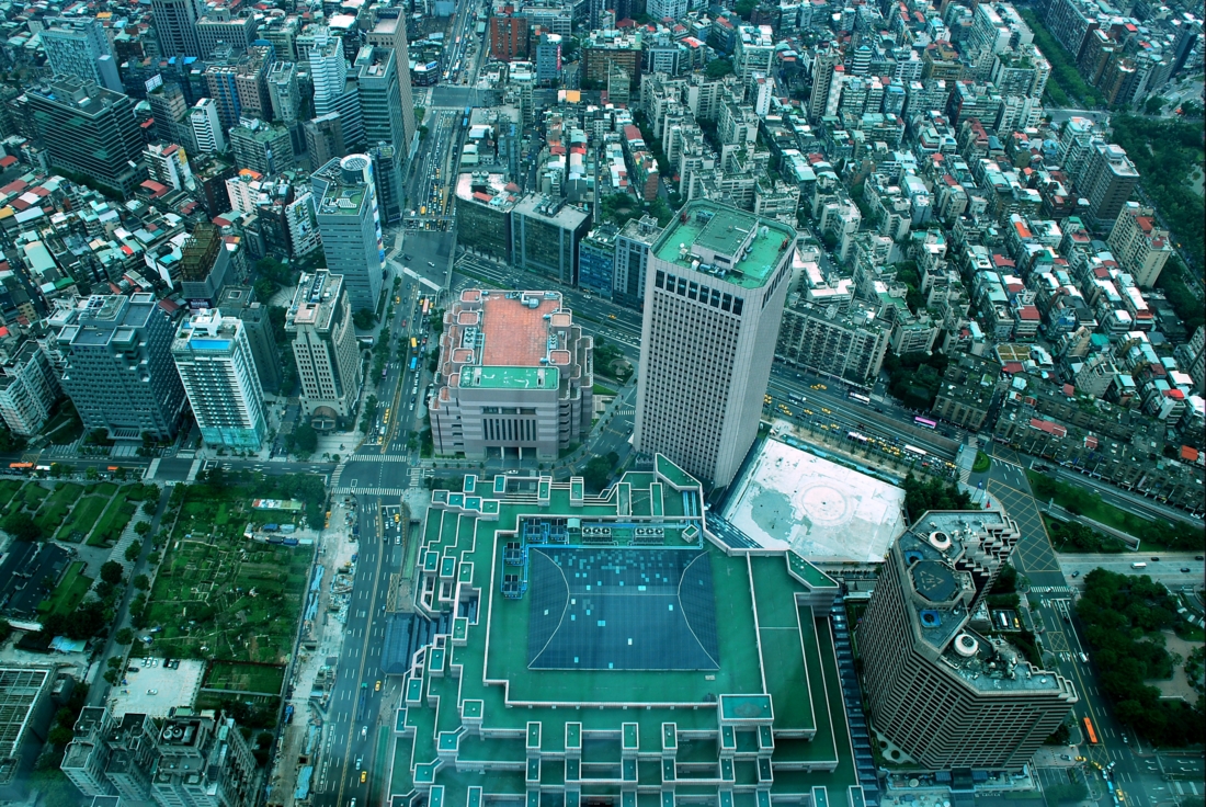 The 2010 WPGM was held at the Taipei Intl. Convention Center (brick-color roof); view from 382 m above ground level at the Taipei 101 Tower.